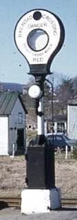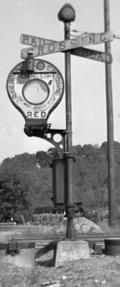 The Hall "banjo" disc crossing signal was one of the earliest forms of an automatic visual warning device to be used at railroad crossings. To understand these signals, it must be noted that the disc signal itself dates back to 1871, when it was designed as a wayside signal. 3 discs, one green, one yellow, and one red, were housed in a wooden frame. The signal aspect would be whatever color disc dropped into view. For a colored photo of one in service, click here.