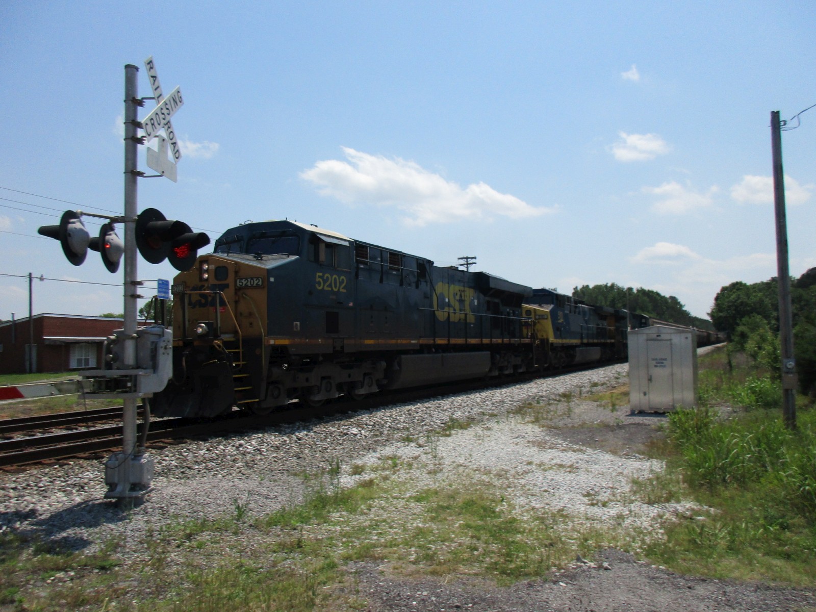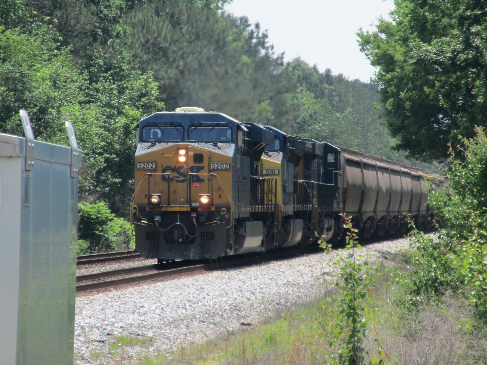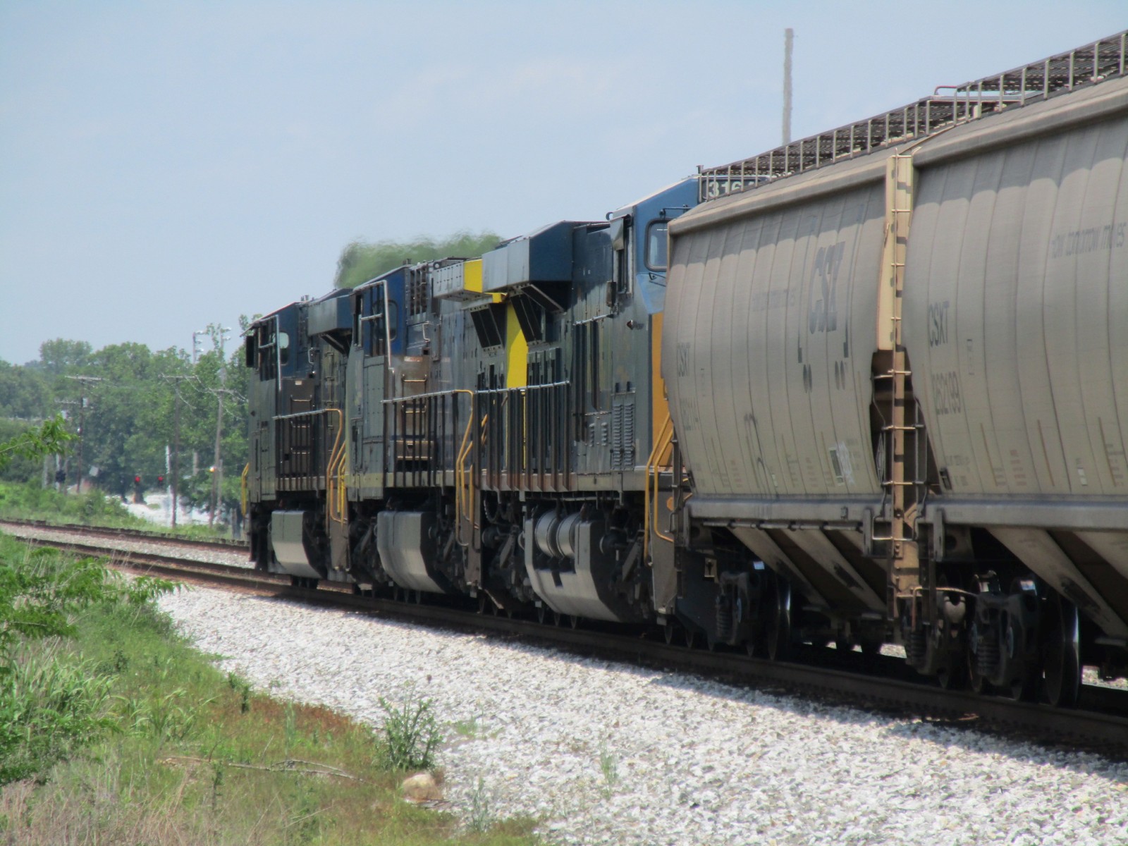 The train is a northbound grain train being pulled by an ES40DC, an AC44CW, and an ES44AH. |