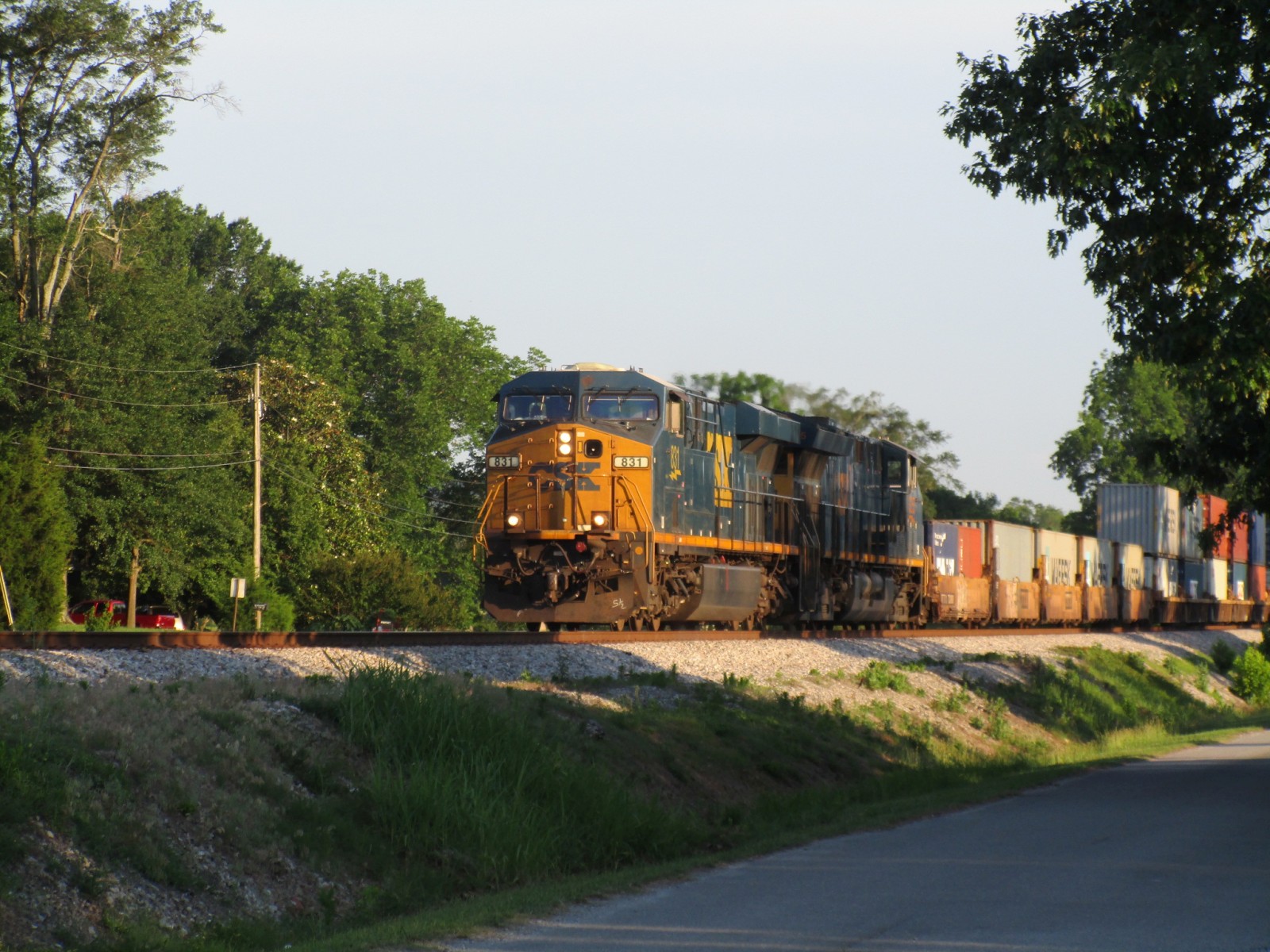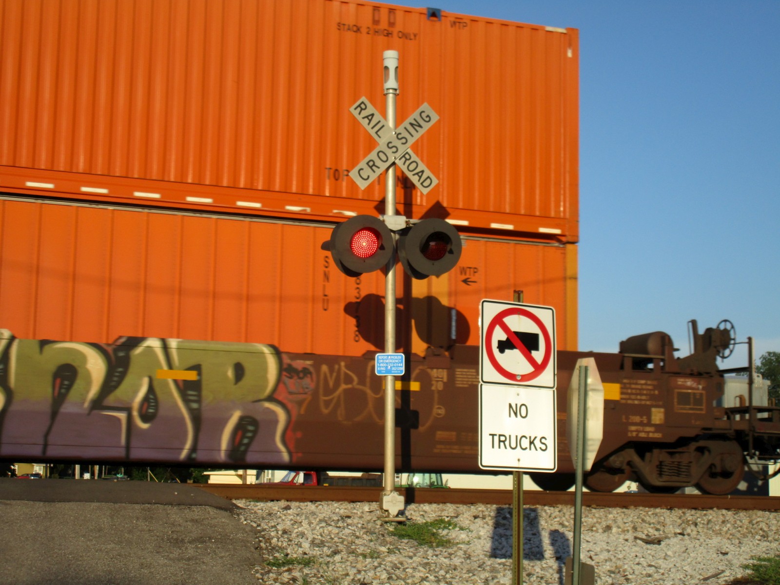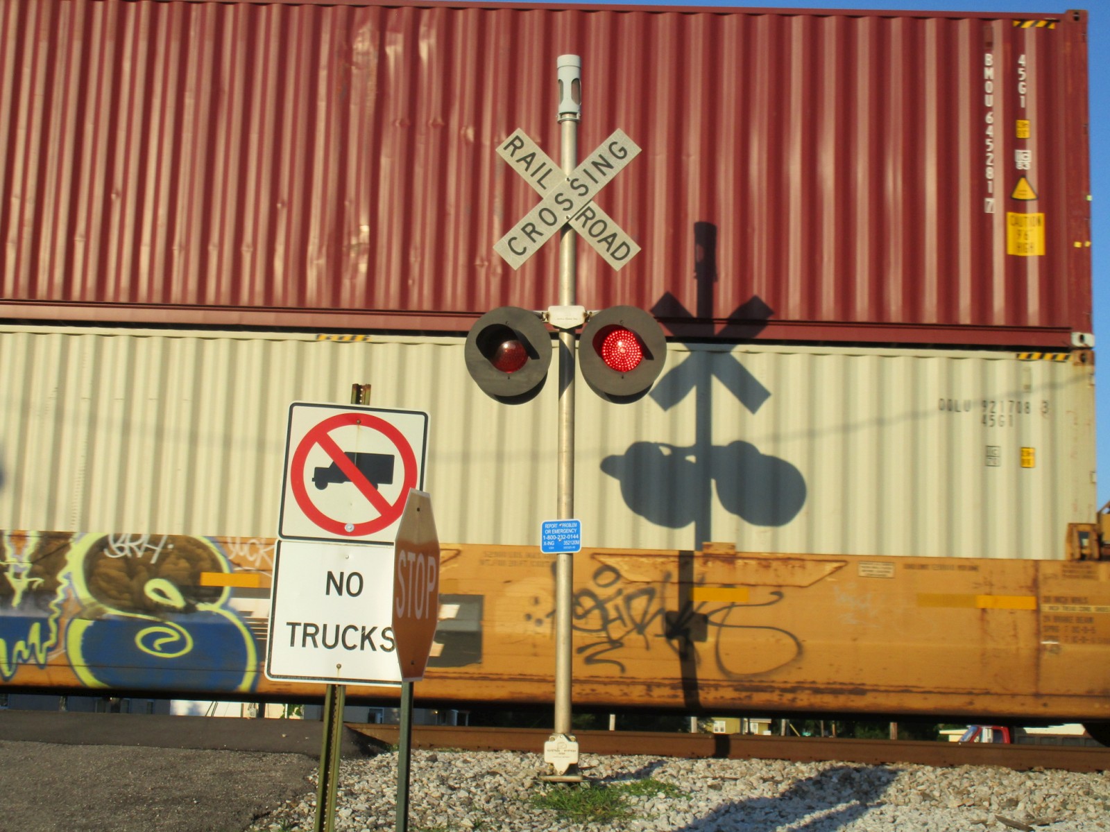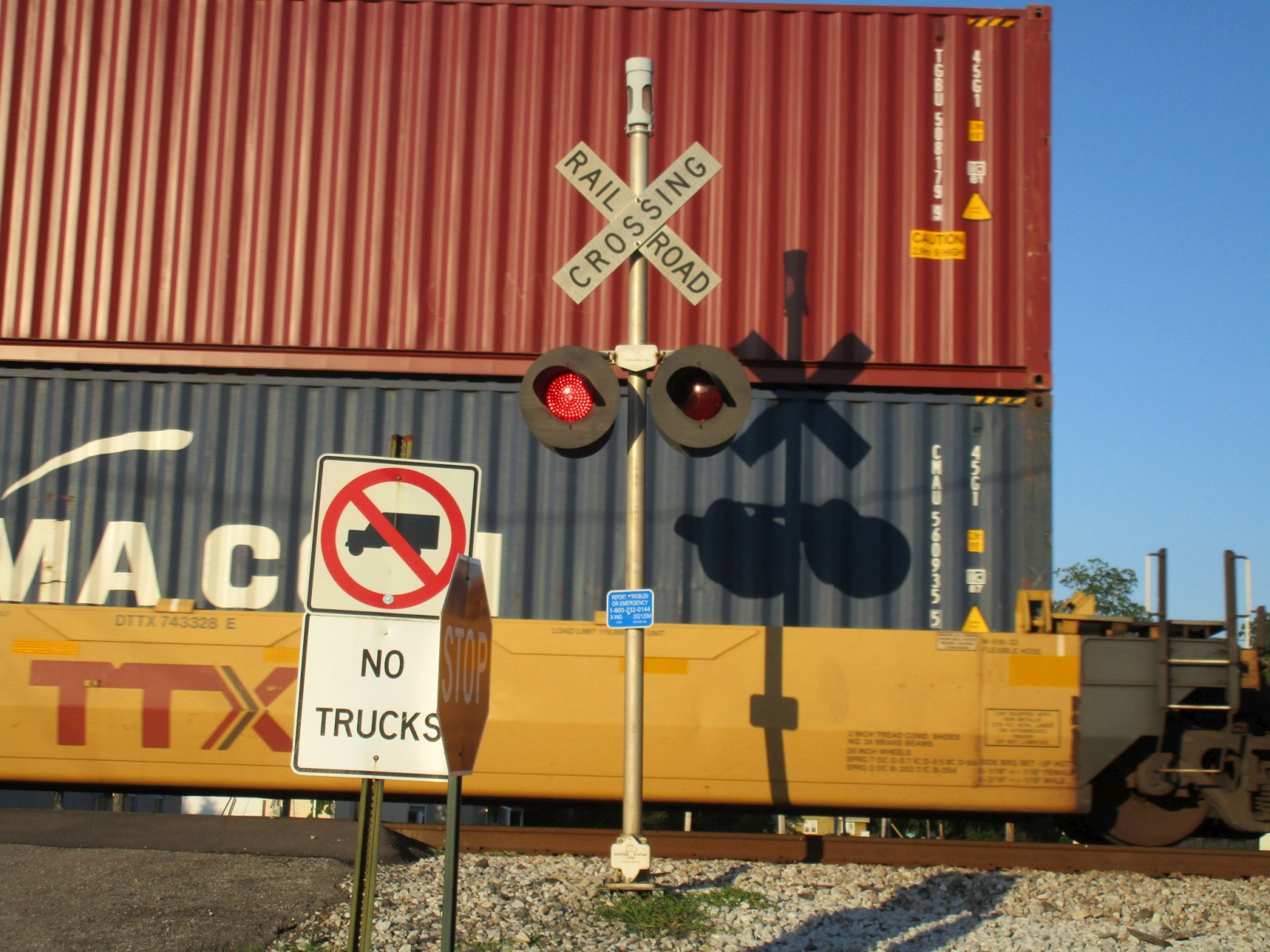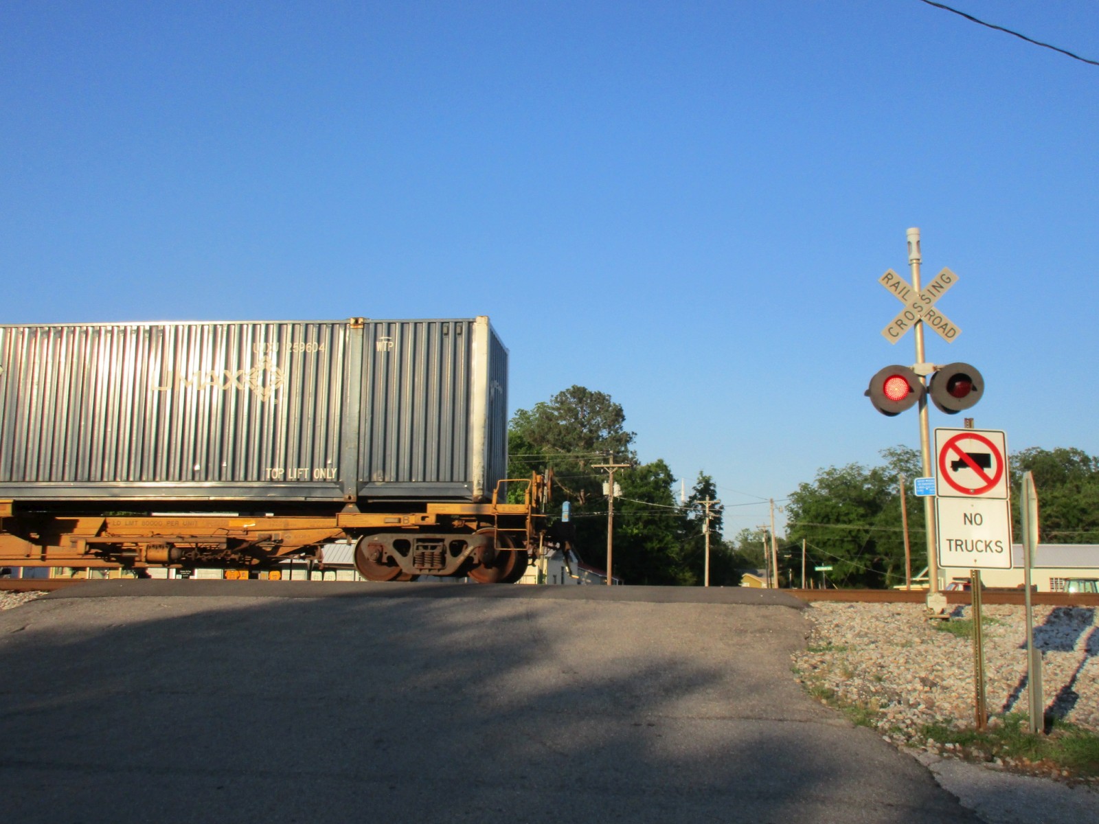 An ES44AH and an ET44AH pull a northbound intermodal train through the crossing. |