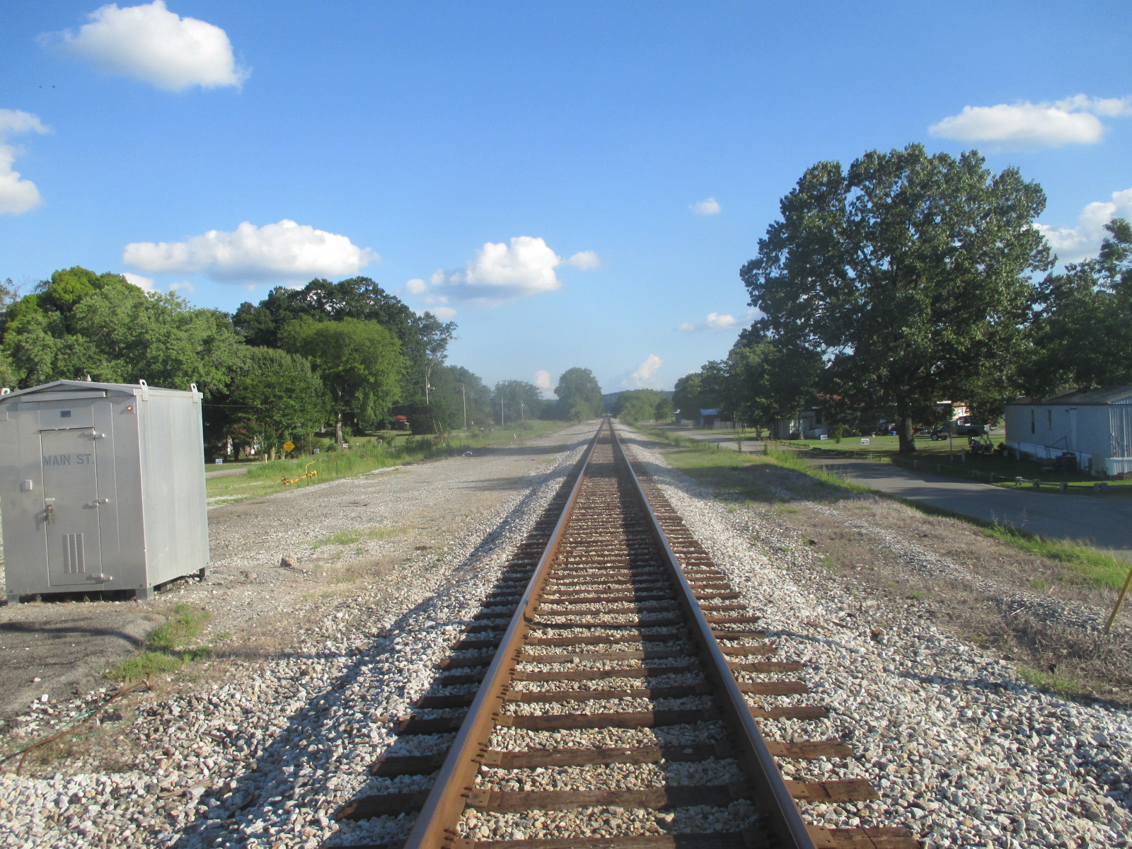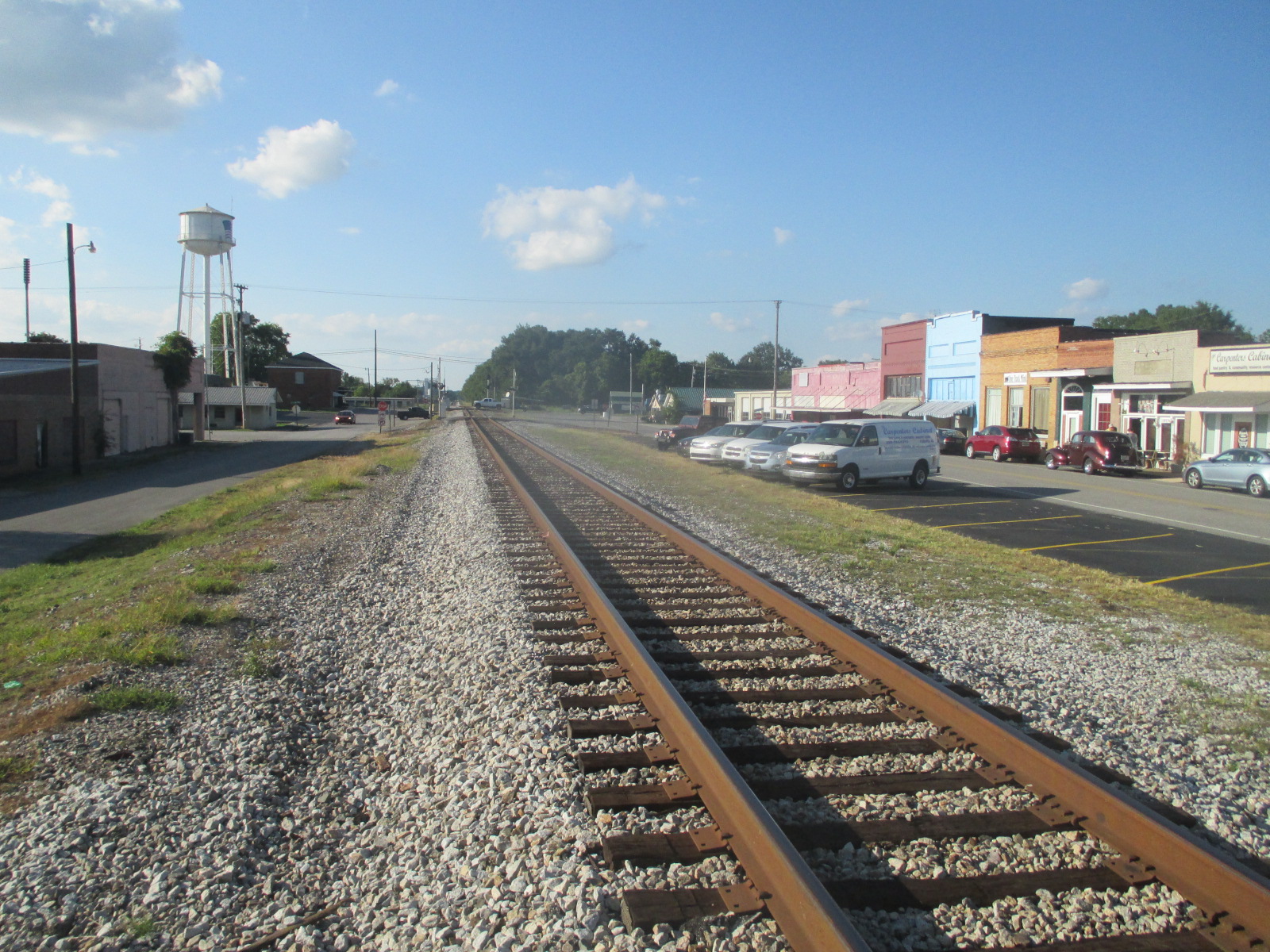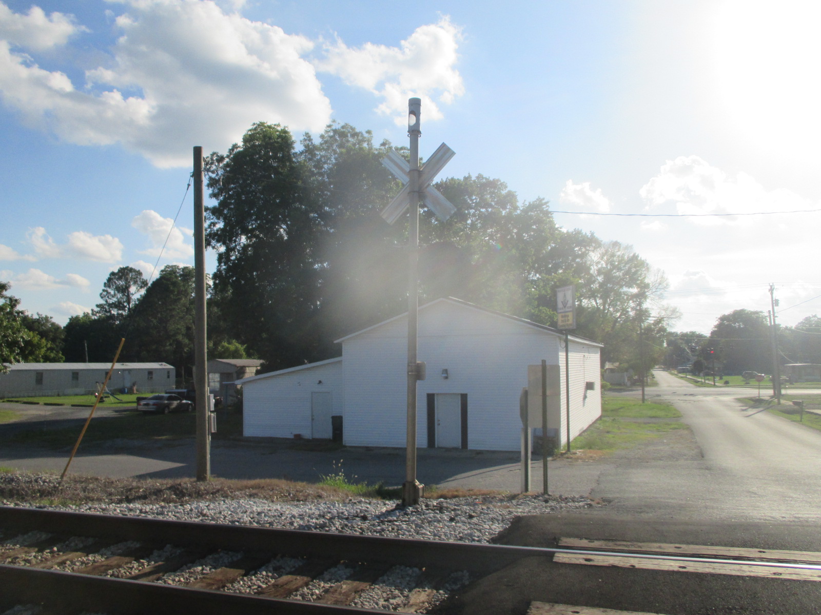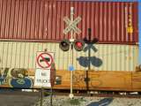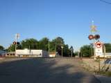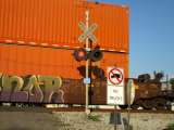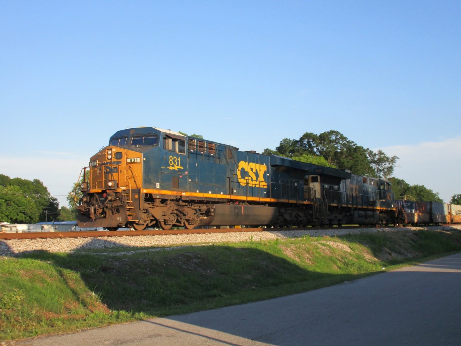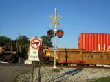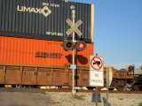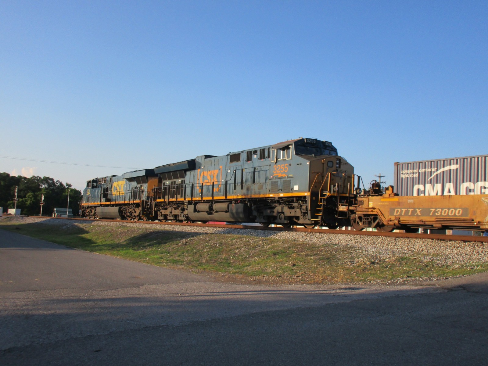 An ES44AH and an ET44AH pull a northbound intermodal train through the crossing. |