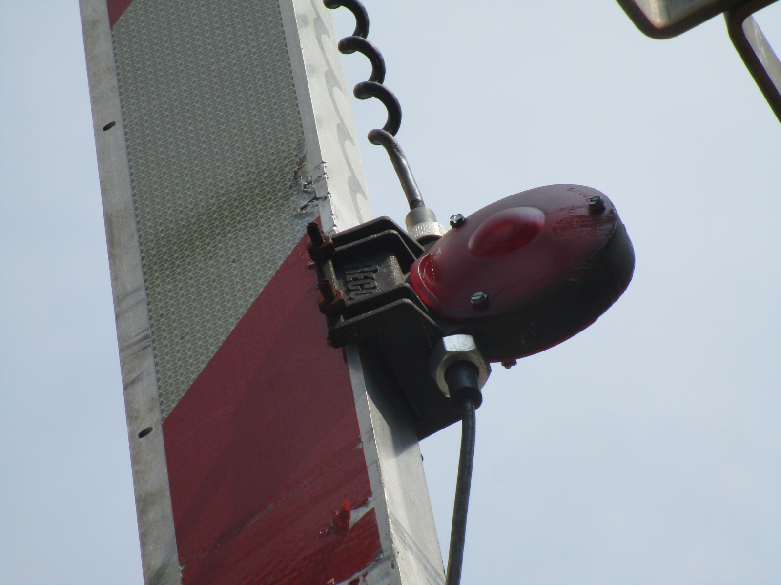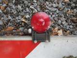 Part of an older gate arm lays next to the crossing with a RECO gate light still attached to it. |