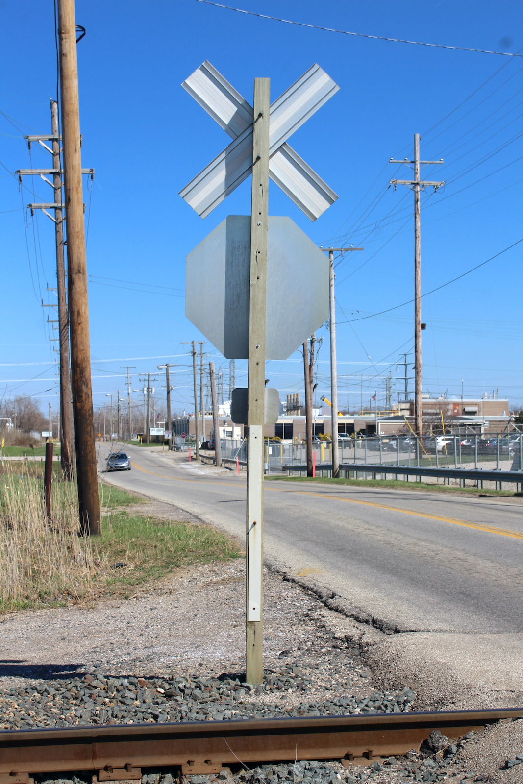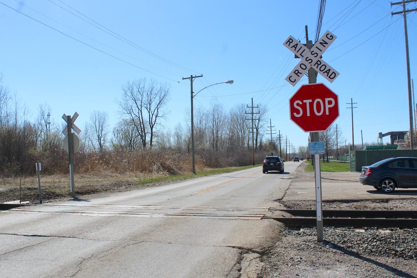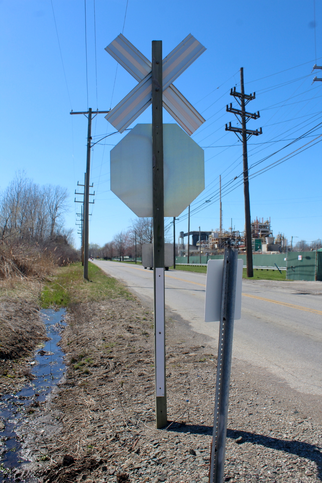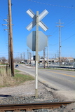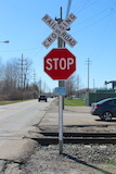 | Overview of 2 crossbucks with stop signs facing east. | Overview facing west. |