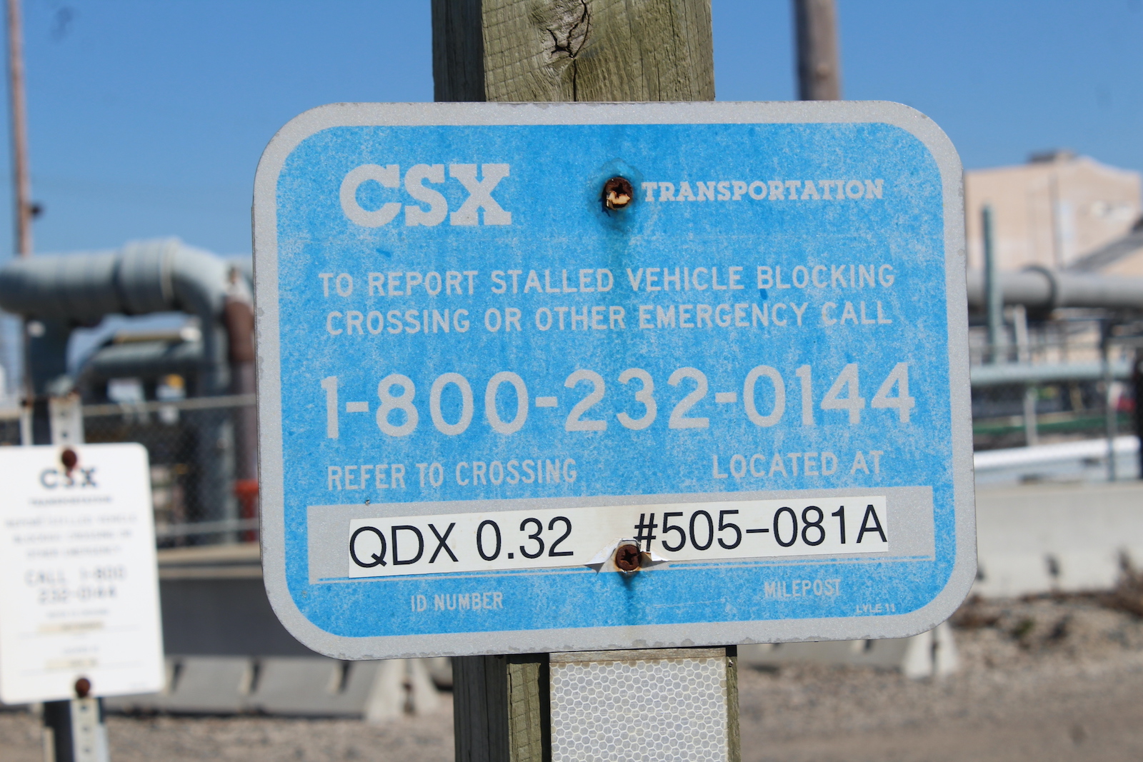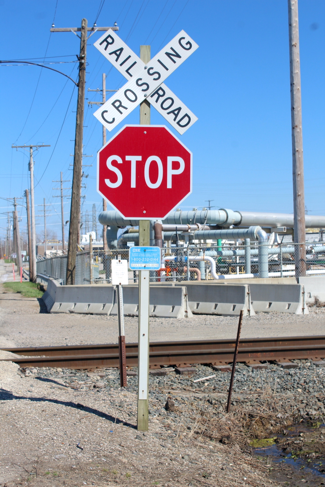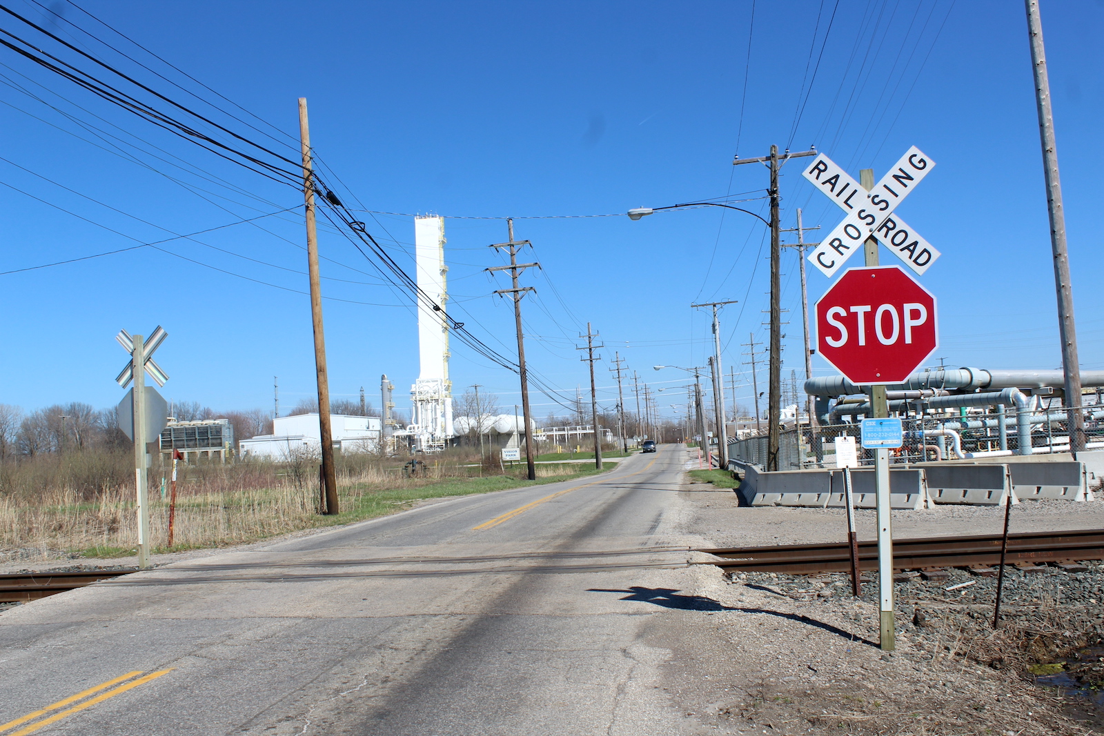 | Overview of 2 crossbucks with stop signs facing east. | Overview facing west. |