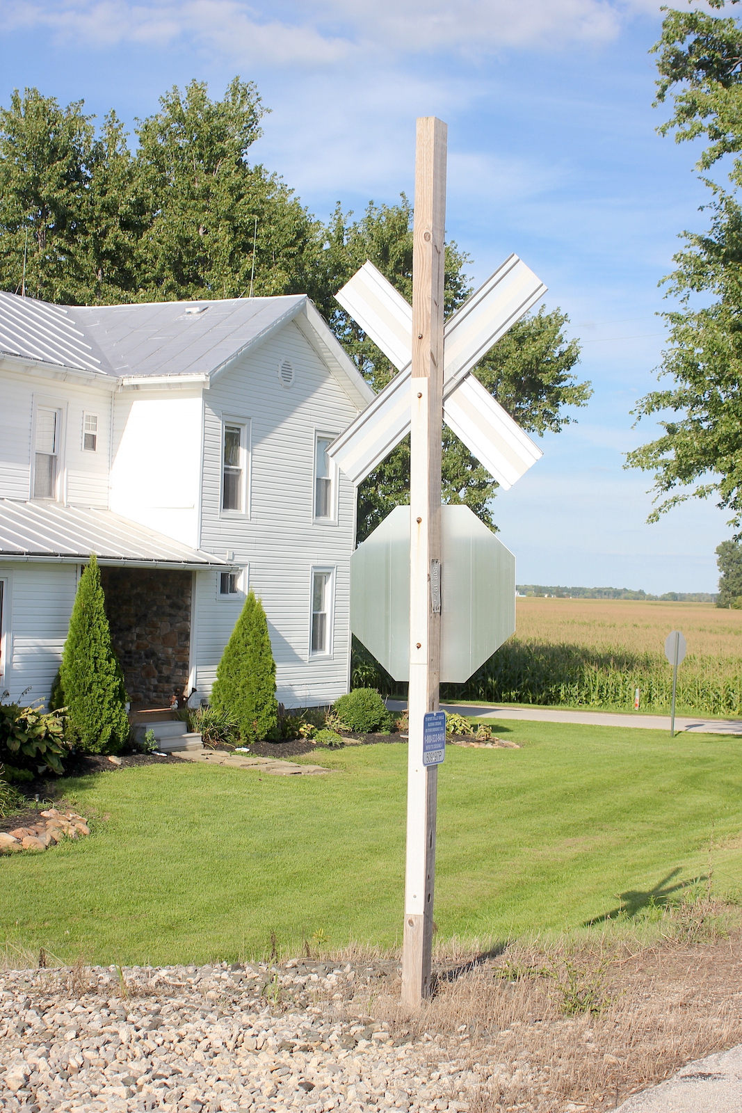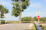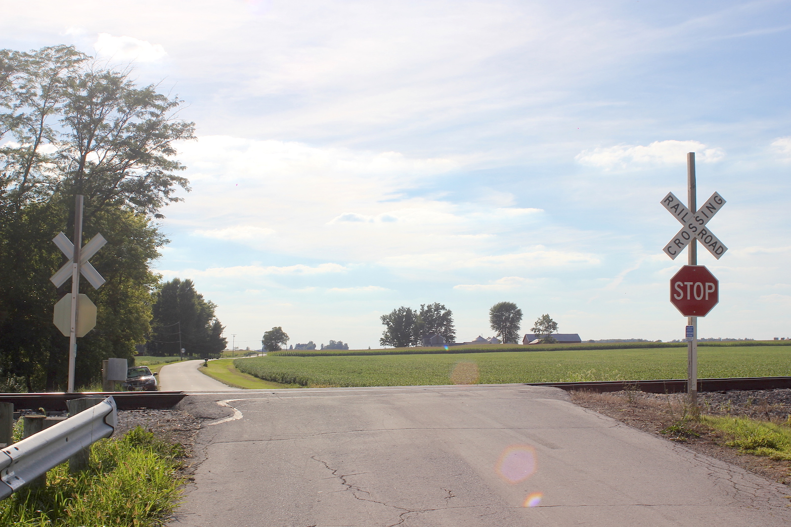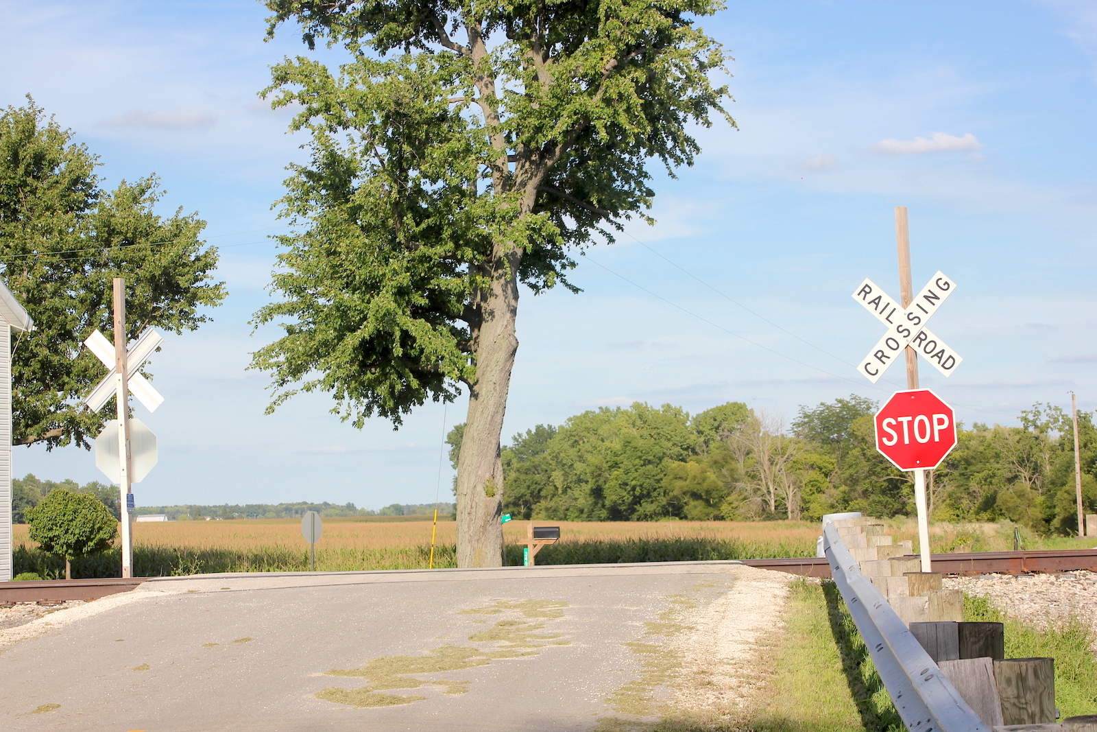 | Overview of 2 crossbucks with stop signs facing east. |