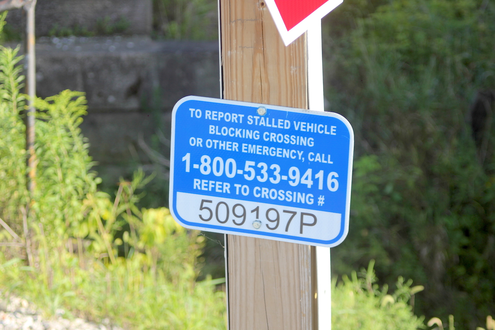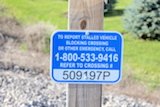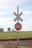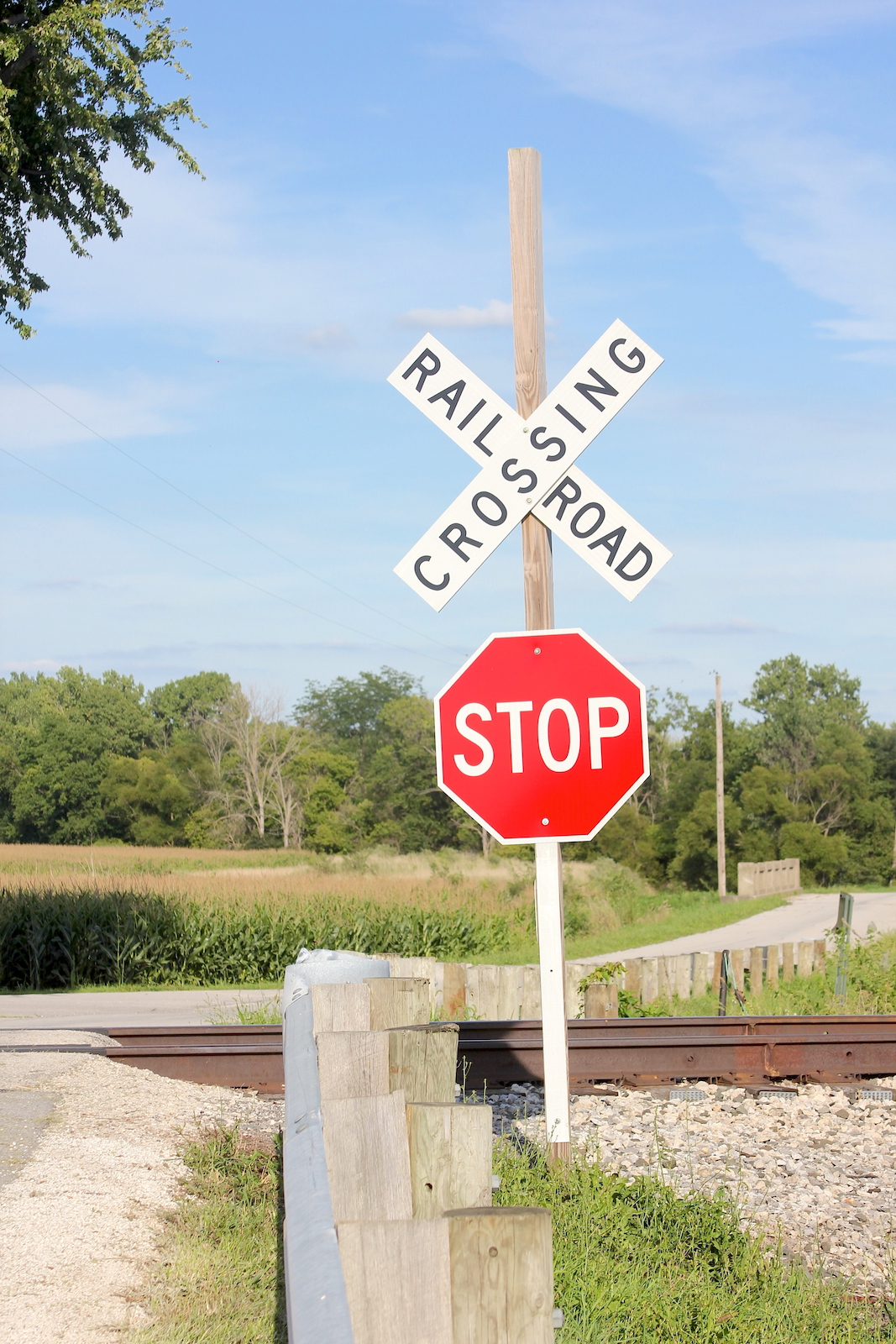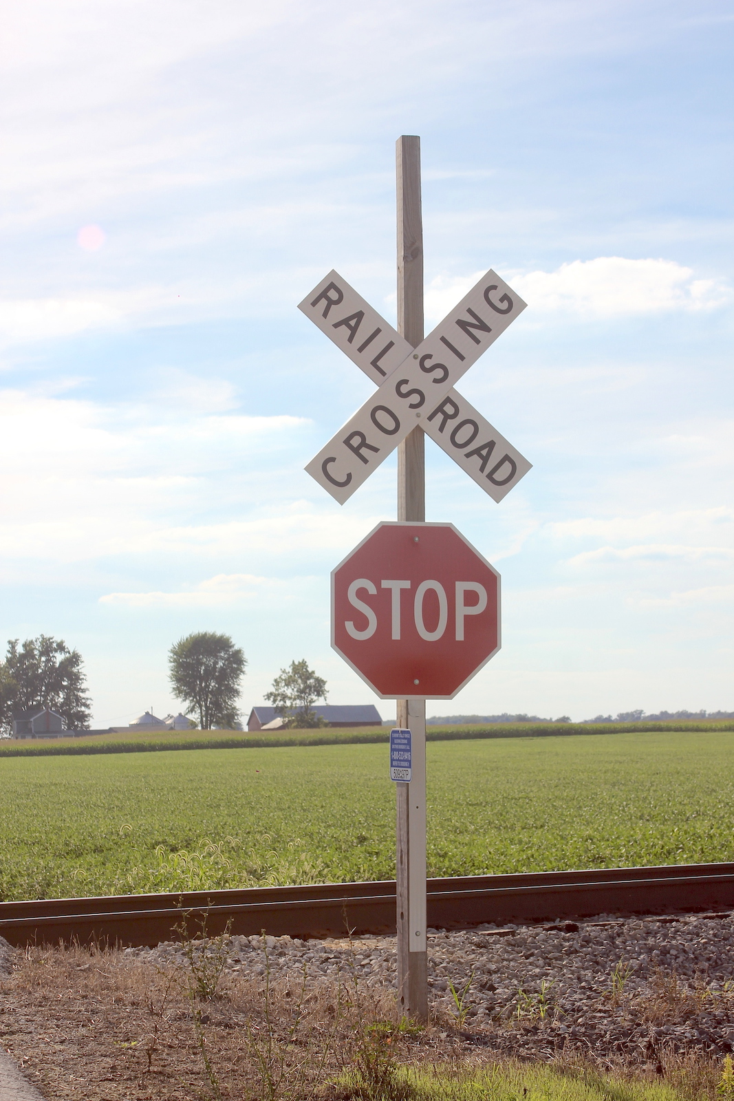 | Overview of 2 crossbucks with stop signs facing east. |