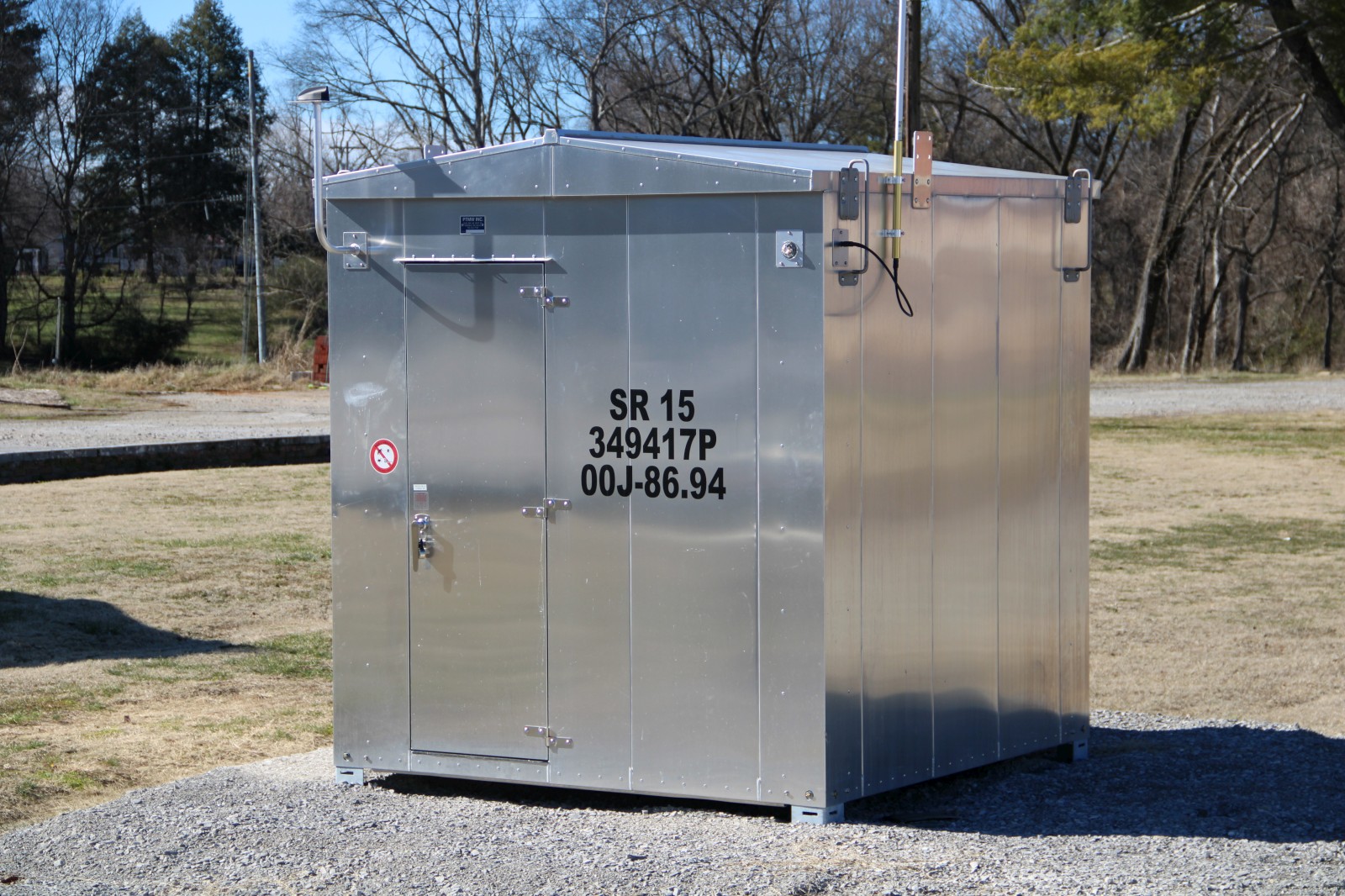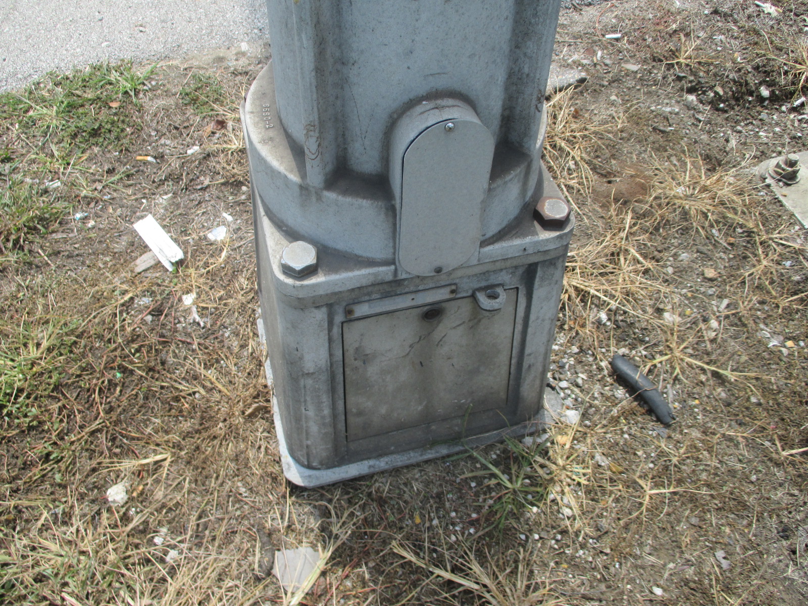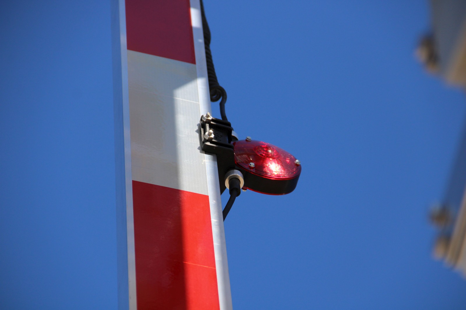 A Modern Industries base supports the mast of a Safetran gate mechanism. |