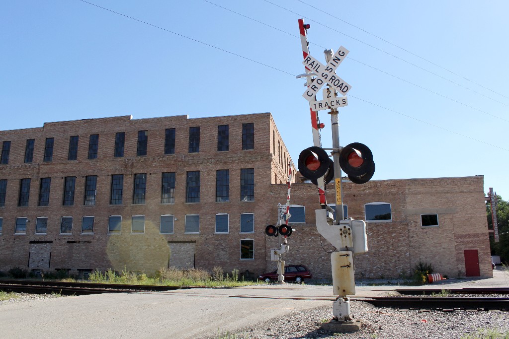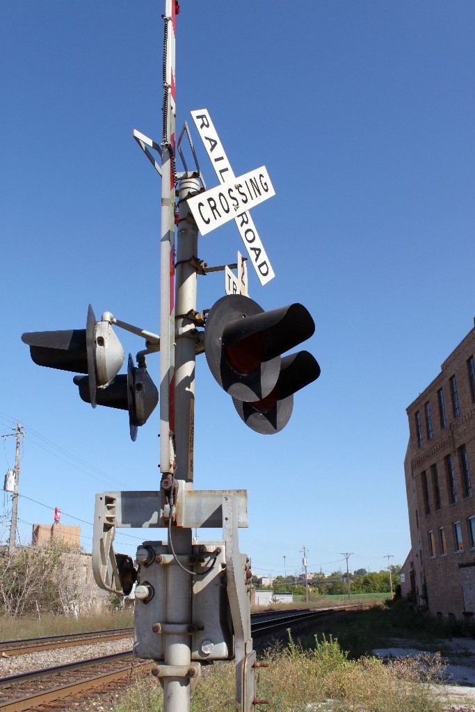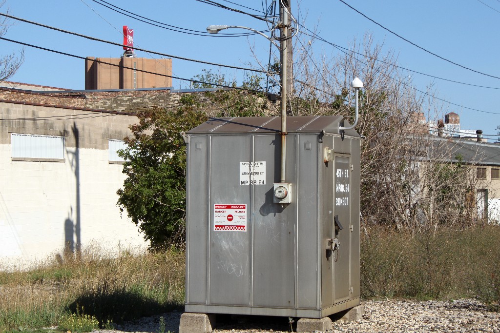 45th St. is just a dead-end access road to some businesses at this point. These signals have 12"x24" Safetran lightheads with Harmon fading LEDs. The WCH mechanical bell originally stopped ringing when the gates fully lowered, but sometime in the late summer of 2011 it was adjusted to ring from activation to shutdown.